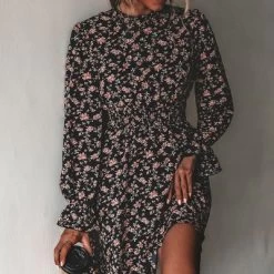 Go to brunch with your girls in style in this mini dress featuring a ditsy floral print, round neckline, long trumpet sleeves with flounce cuffs, smocked trim, and an A-line silhouette. Step into this mini dress and embrace its versatile charm, perfect for any occasion where you want to radiate elegance and confidence.Product Code: CAA05A2F135ZZ